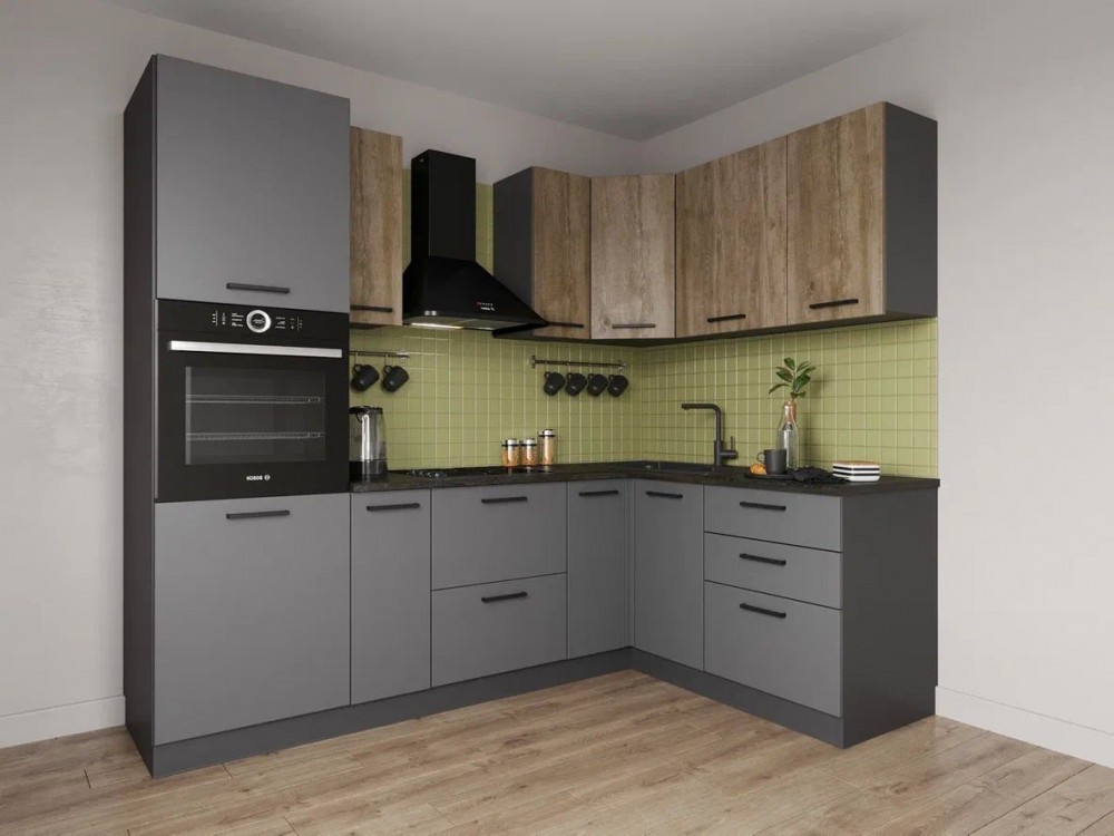 Кухонный гарнитур Умбра 2400*1600 (Стол. 26мм) Верх Корпус: Антрацит Верх Фасад: Ель Умбра (№343) МДФ Низ Корпус: Антрацит Низ Фасад: Берлин (№962) МДФ Столешница: Детройт Описание: Корпус ЛДСП 16 мм, кромка ПВХ 0,4 мм. Фасады ЛДСП 16 мм, кромка ПВХ 1мм. Фасады МДФ 16 мм Фасады верхних модулей со свесом 12 мм дают возможность использовать без установки ручек. Петли с доводчиком. Навесы внутренние, регулируемые, с декоративной крышкой. Направляющие шариковые полного, плавного выдвижения с нагрузкой до 30 кг. Столешницы цельные с пластиковым покрытием со скруглением по переднему краю (постформинг толщина 26 мм). Регулируемые ножки-опоры.
