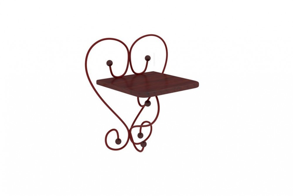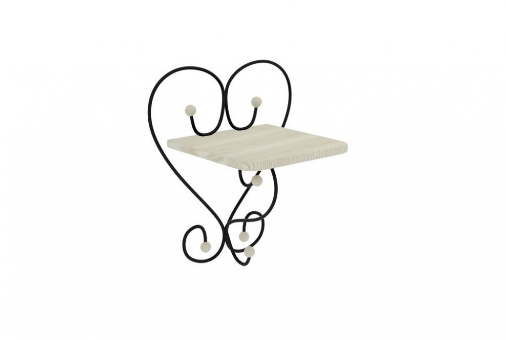 Металлическая настенная полка станет прекрасным дополнением к кровати. Фигурные завитки на кронштейне полки повторяют узор спинок кровати, делая интерьер спальни завершенным.