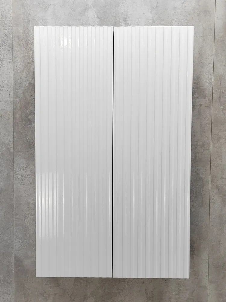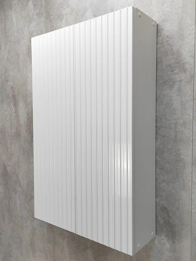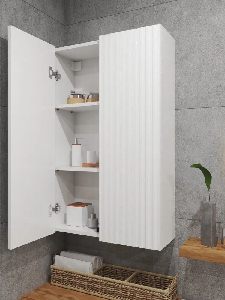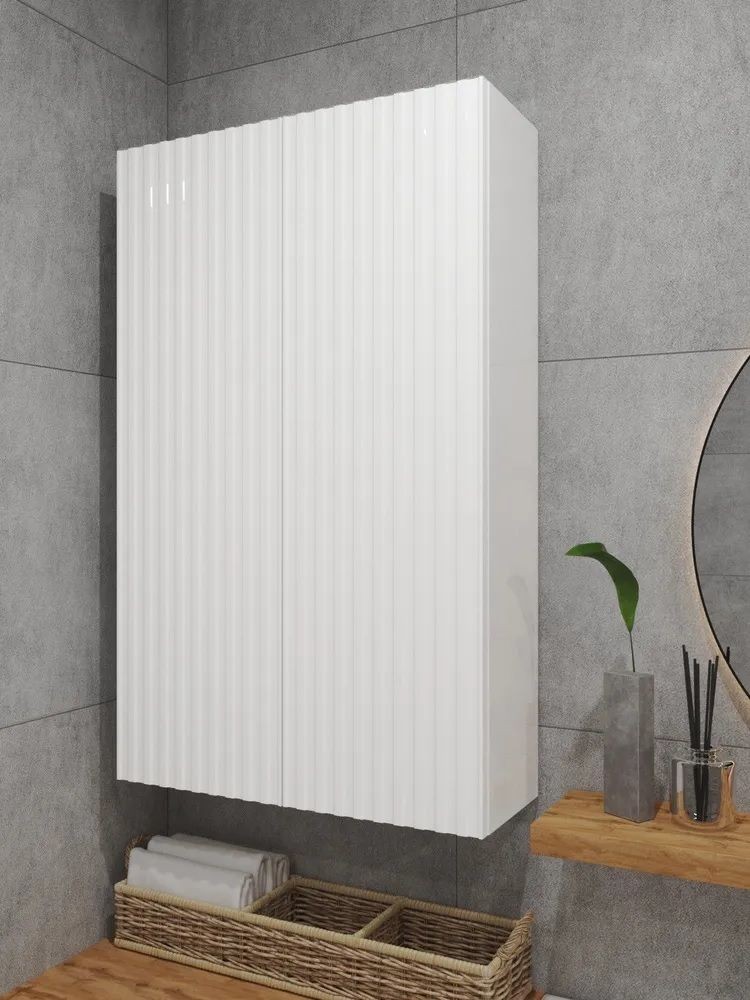 Белый шкаф с рифлёным фасадом будет отлично и стильно смотреться как в ванной, так и в туалете.