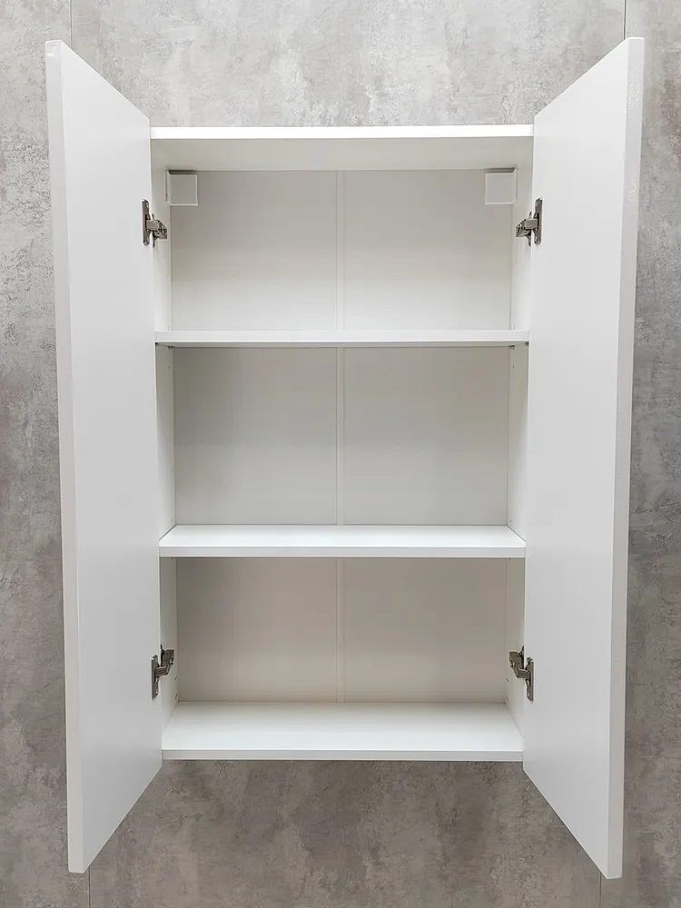 Полки в навесном шкафу регулируются по высоте.