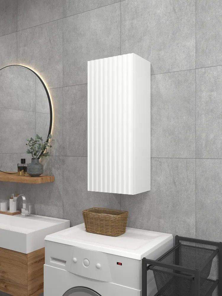 Белый шкаф с рифлёным фасадом будет отлично и стильно смотреться как в ванной, так и в туалете.