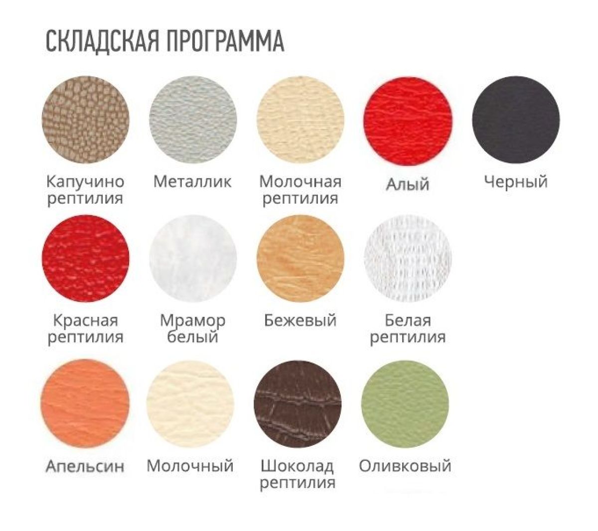 Цвет кожзам: Белая рептилия, Капучино рептилия, Красная рептилия, Молочная рептилия, Шоколадная рептилия